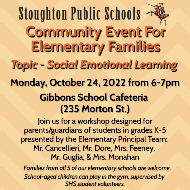 Parents/guardians of elementary school students are invited to join us at the Gibbons School cafeteria (235 Morton St.) on Monday, October 24, 2022 from 6-7 p.m. for a community event to learn about Social Emotional Learning and the various programs we currently utilize within our schools.