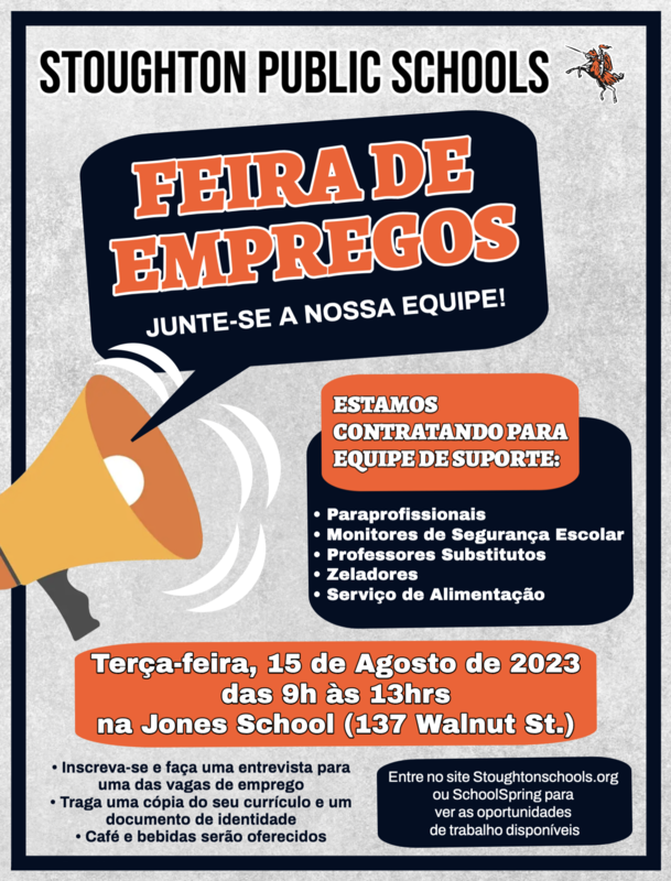 The Stoughton Public Schools will be holding a Hiring Fair for support staff positions on Tuesday, August 15, 2023 from 9am - 1pm at the Jones Early Childhood Center gymnasium, 137 Walnut St. in Stoughton.