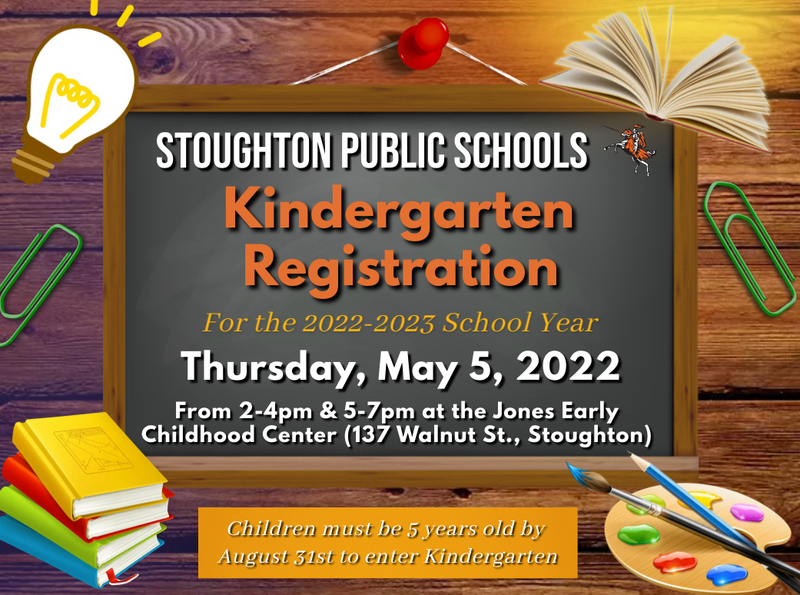 Kindergarten Registration for the upcoming 2022-2023 school year is taking place at the Jones Early Childhood Center, 137 Walnut Street, on Thursday, May 5, 2022 from 2pm-4pm and from 5pm-7pm.